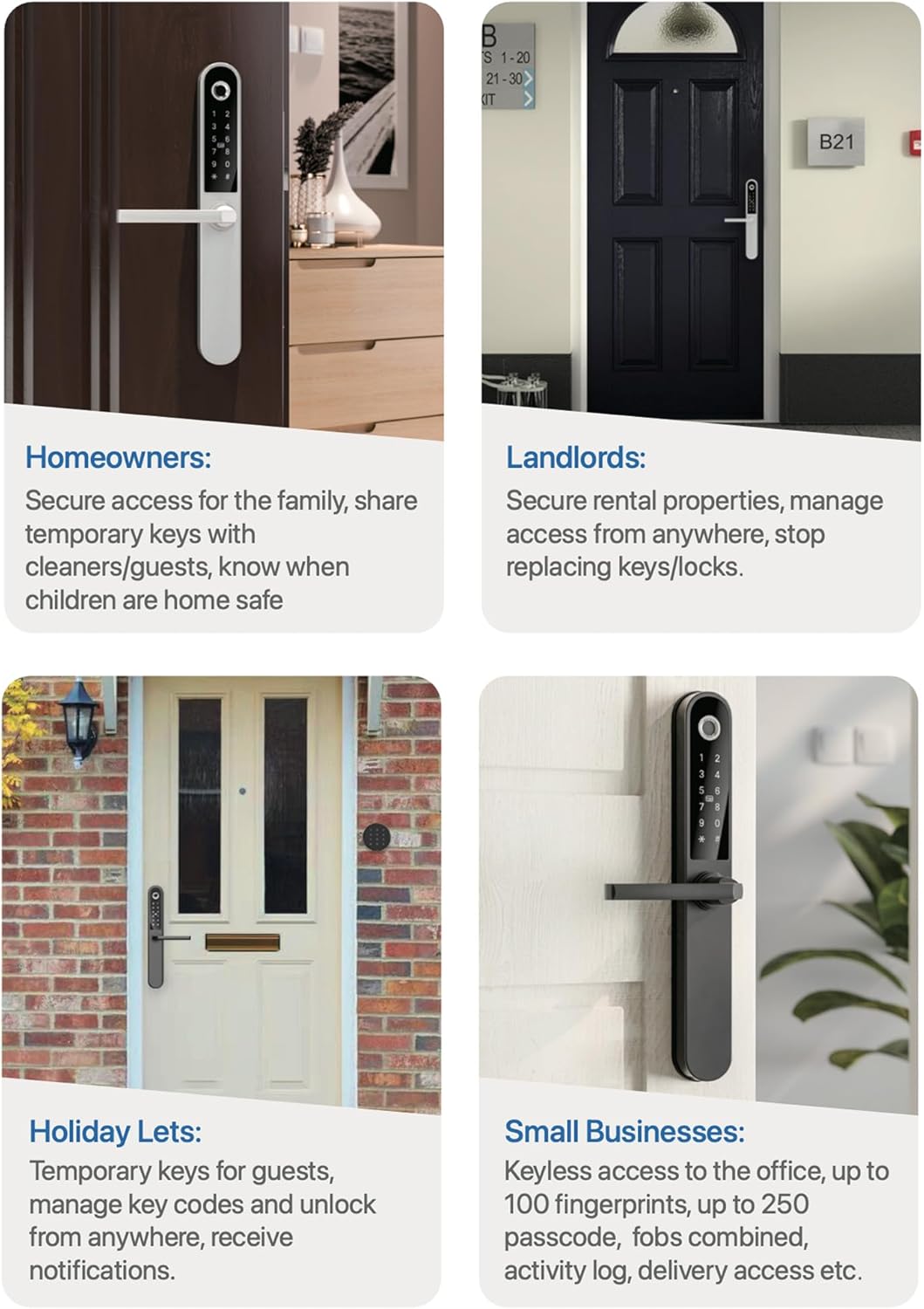 完全防水 - Apollo は丈夫なアルミニウムで作られており、高度な粉体塗装プロセスにより優れた耐食性を実現しています。ロックは完全に防水加工されており、あらゆる気象条件に耐えることができます。基本的に、既存のドア ハンドルと同じ抵抗力を備えているため、心配する必要はありません。