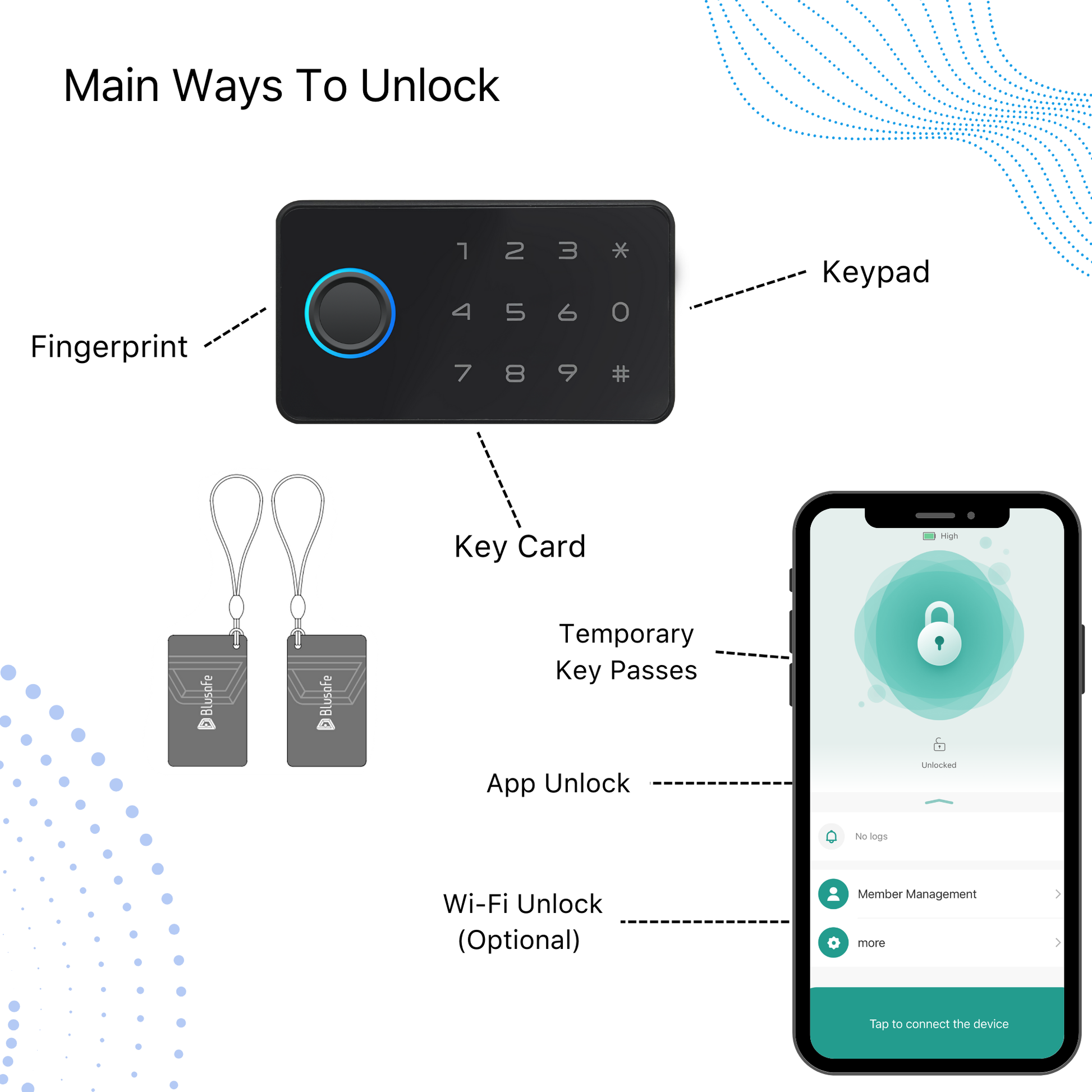 - 複数のロック解除方法 - 1)。 RFID カードをスワイプしてロックを解除します。 2).スマートフォンNFC機能; 3)。 Blusafe スマート アプリ (iOS および Android) - 最大 300 人のユーザーをサポートします。