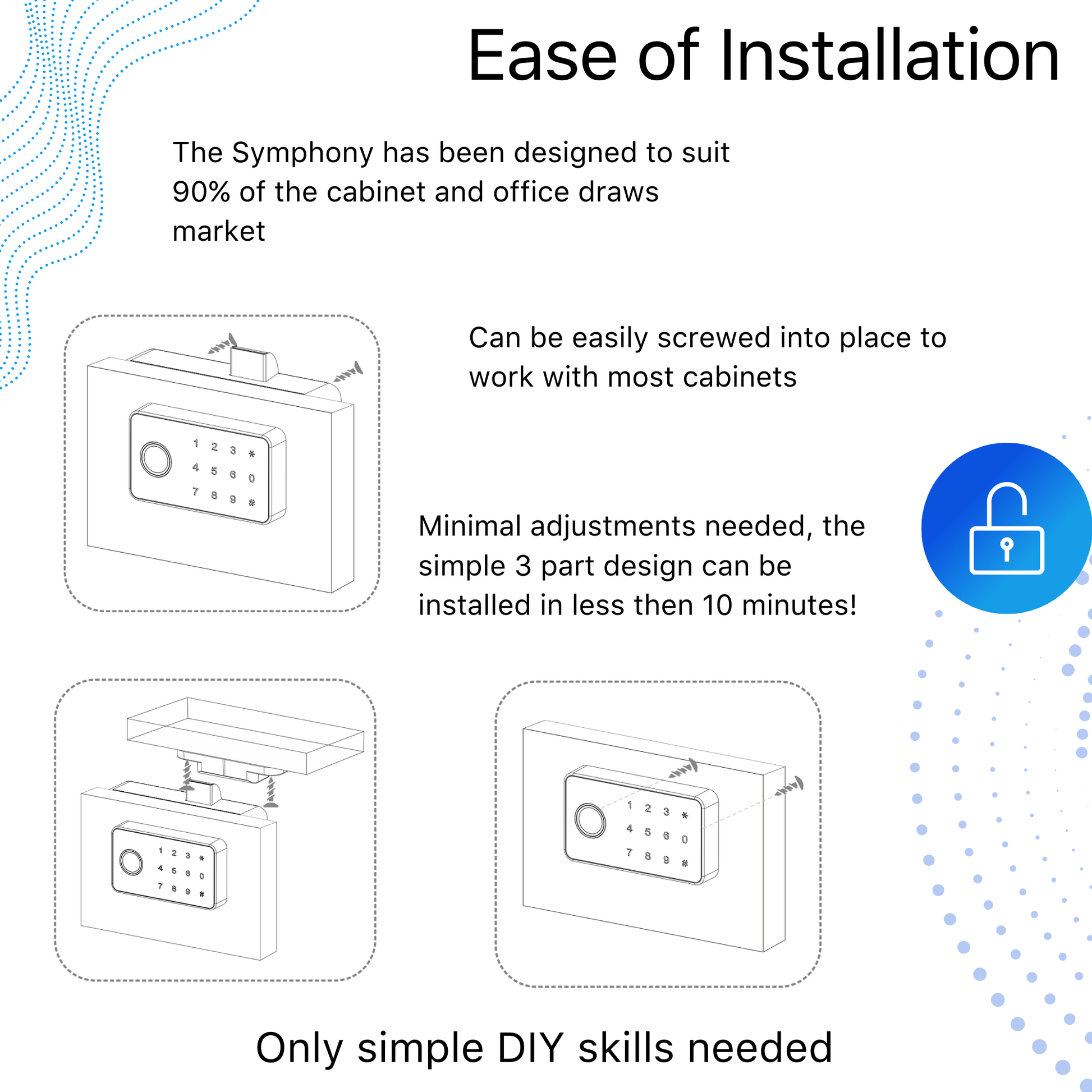 - 簡単なインストール方法 - Symphony は、キャビネットおよびオフィス ドロー市場の 90% に適合するように設計されています。 必要な調整は最小限で、シンプルな 3 つの部分からなる設計で 10 分以内に設置できます。