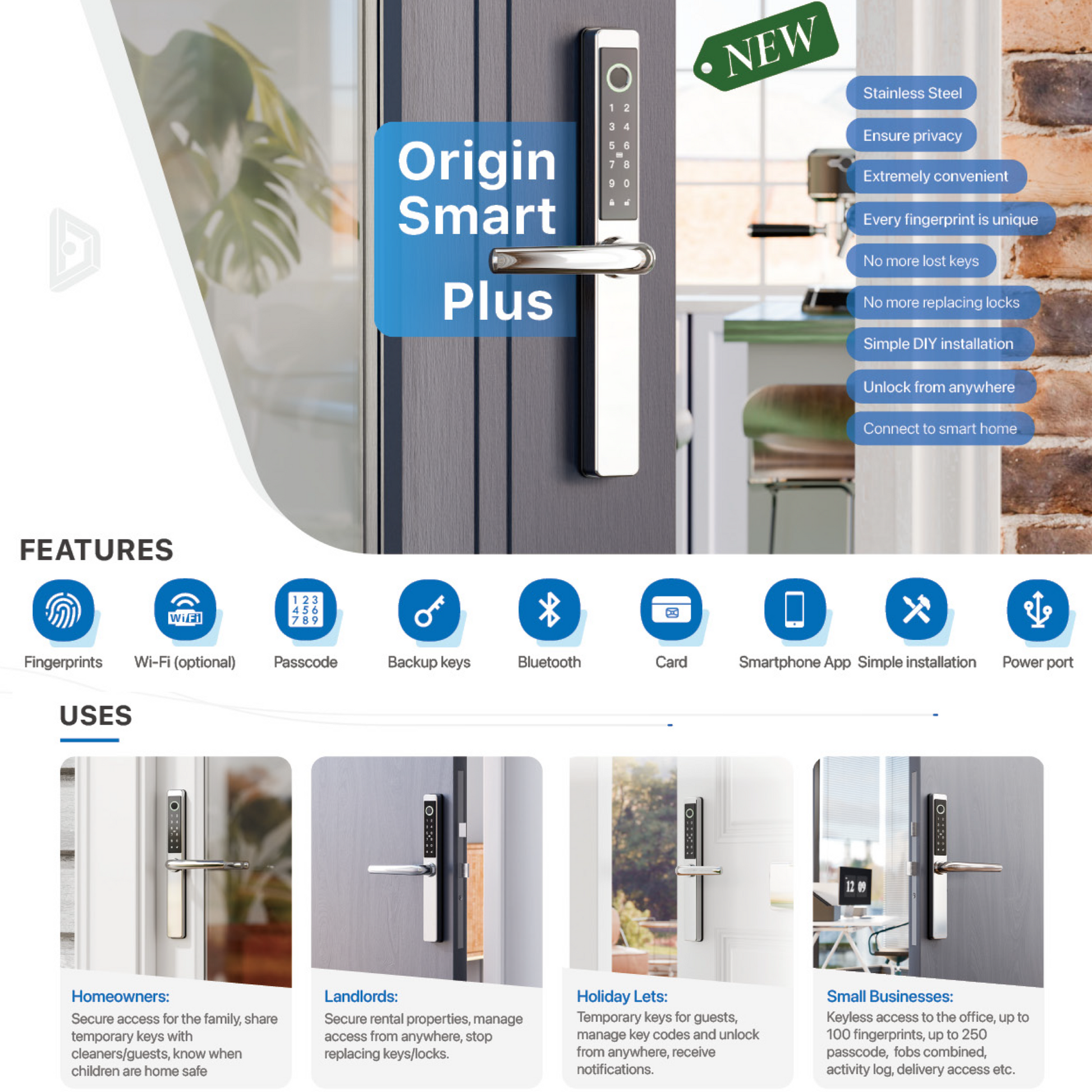 The Origin Smart – Plus is a fully-featured keyless door handle designed for everything from residential homes and apartments to Airbnb properties, small offices, and managed rental units. With a durable stainless-steel body, IP65-rated construction, and compatibility with the TTLock ecosystem, it offers seamless, secure access via fingerprint, passcode, RFID card, or smartphone.