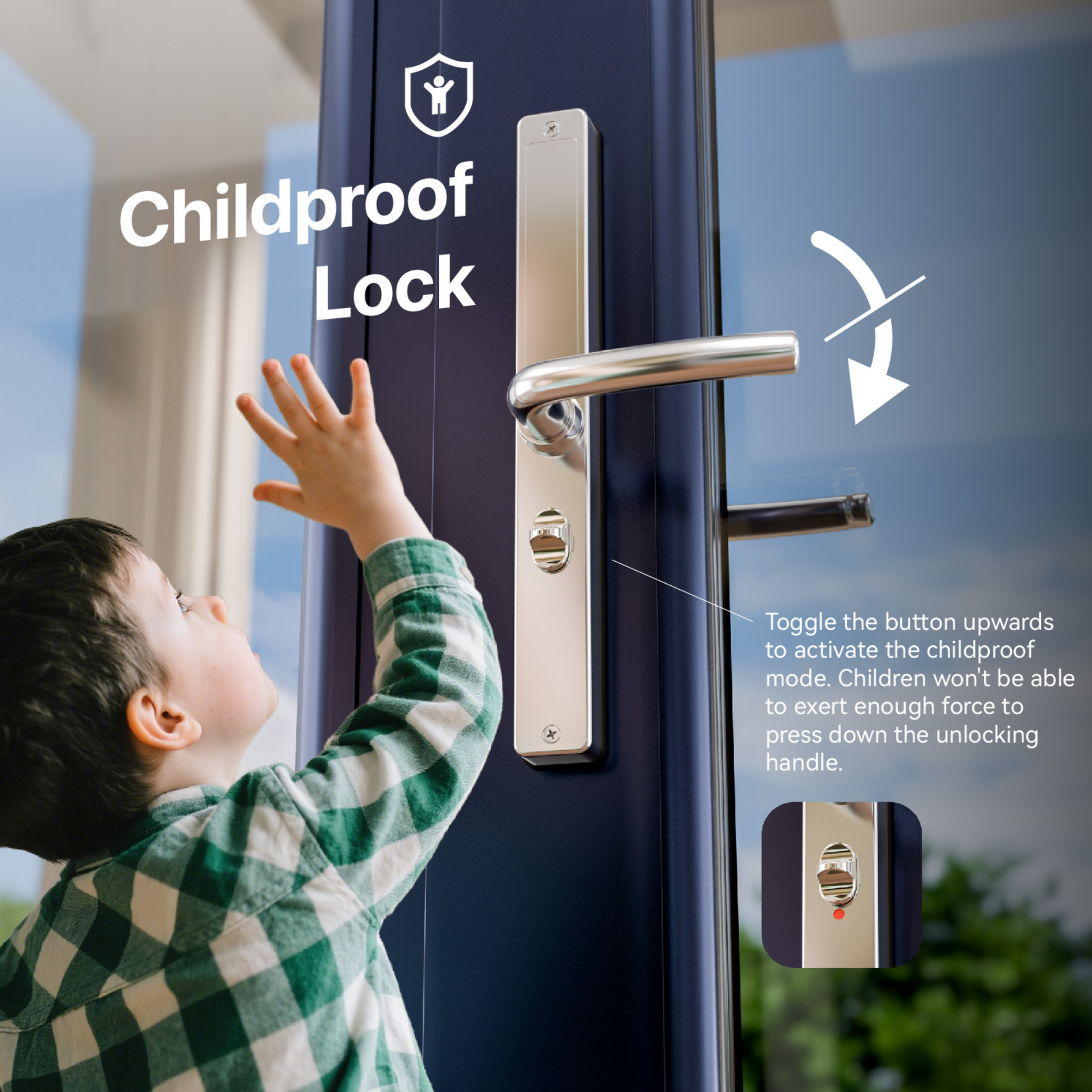 This handle supports up to 100 fingerprints, 250 passcodes, 1000 RFID cards, and remote unlocking via the app when paired with an optional Wi-Fi bridge. It includes a built-in childproof lock, offline AI data storage for total privacy, and adjustable screw centres that fit over 90% of multipoint locks without modification.